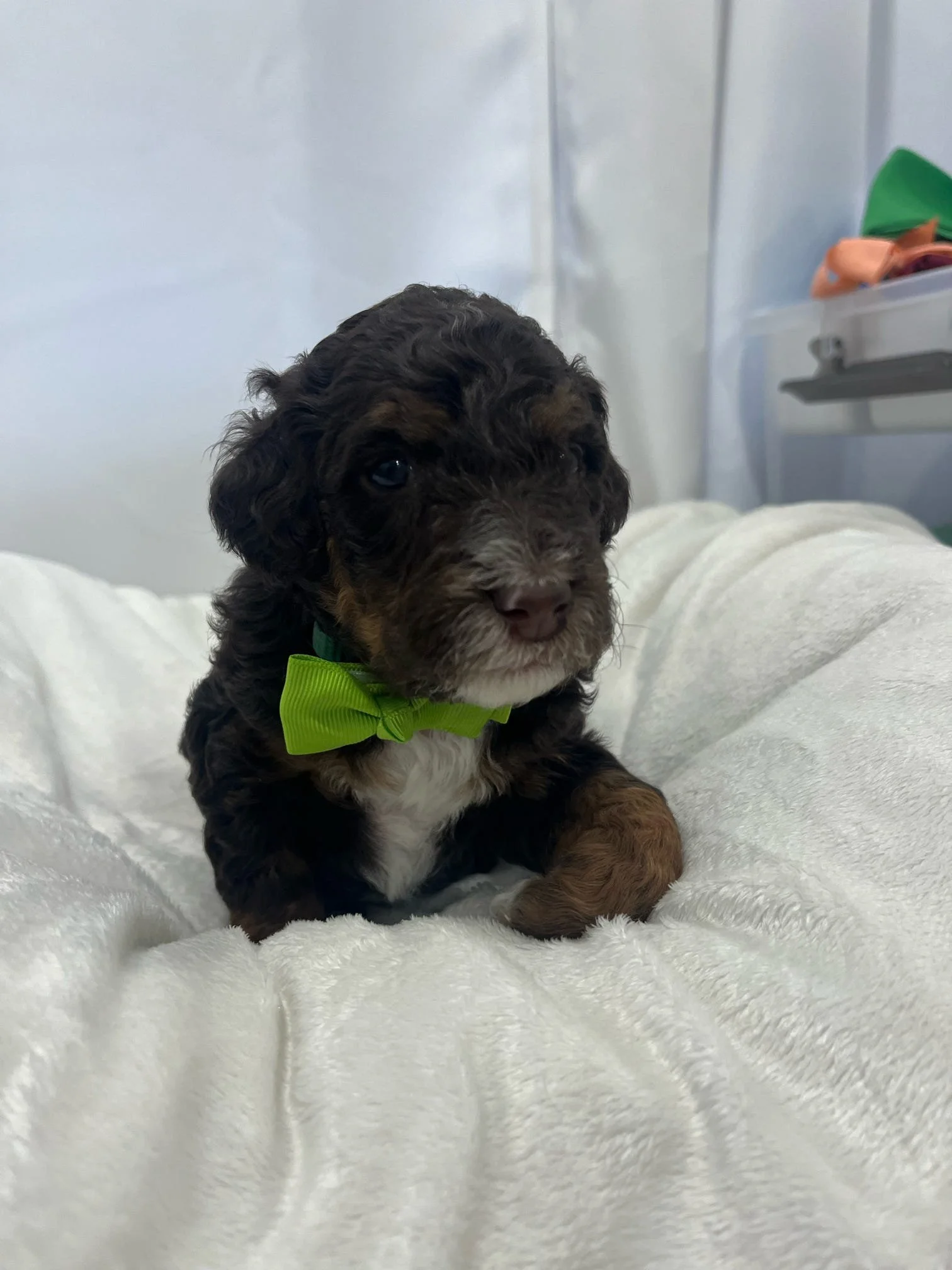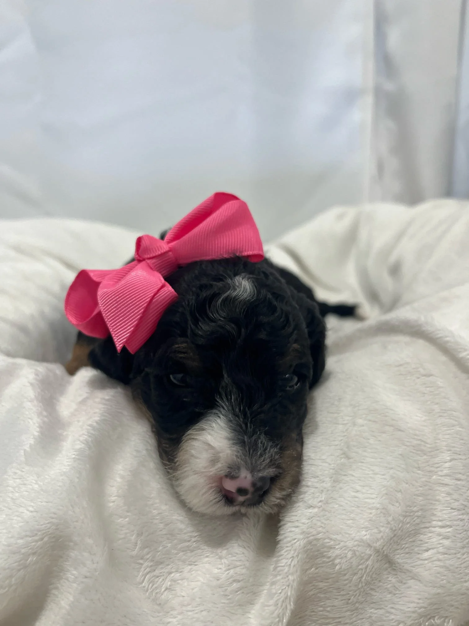 All of her puppies are healthy and gaining weight. These mini Bernedoodle puppies are a mix of brown and black tri colored puppies
