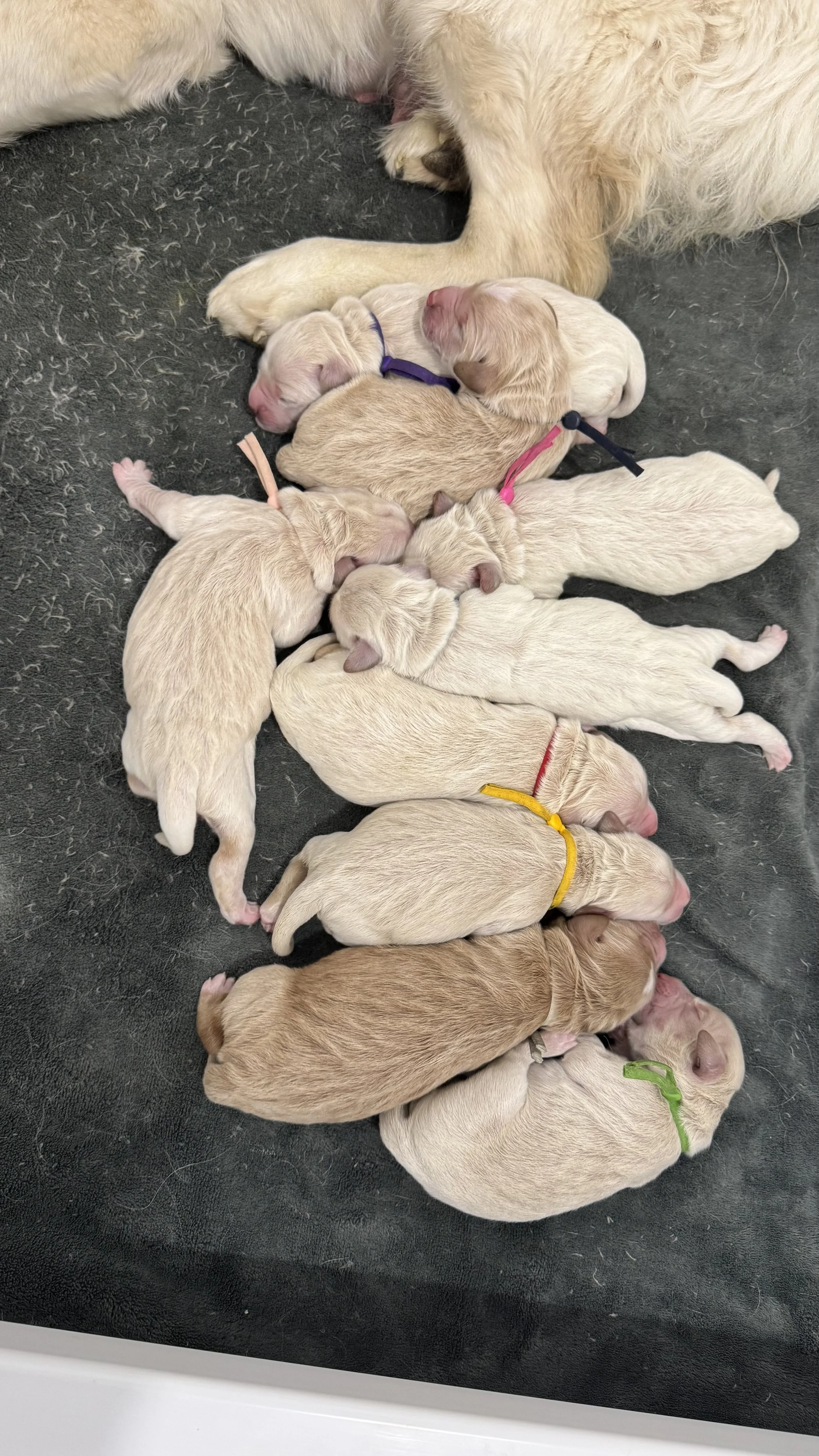 River delivered nine beautiful ultra-goldendoodle puppies in the early morning of August 13th.