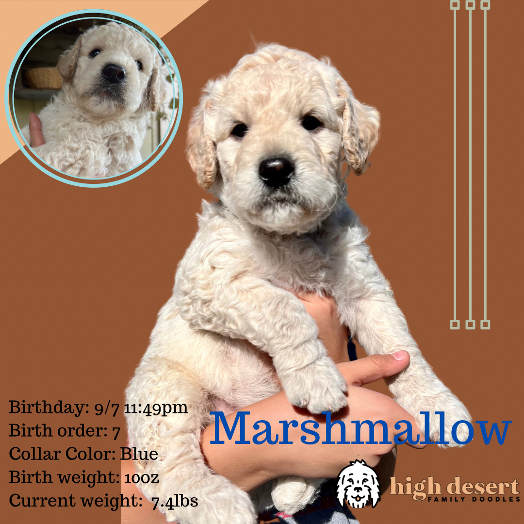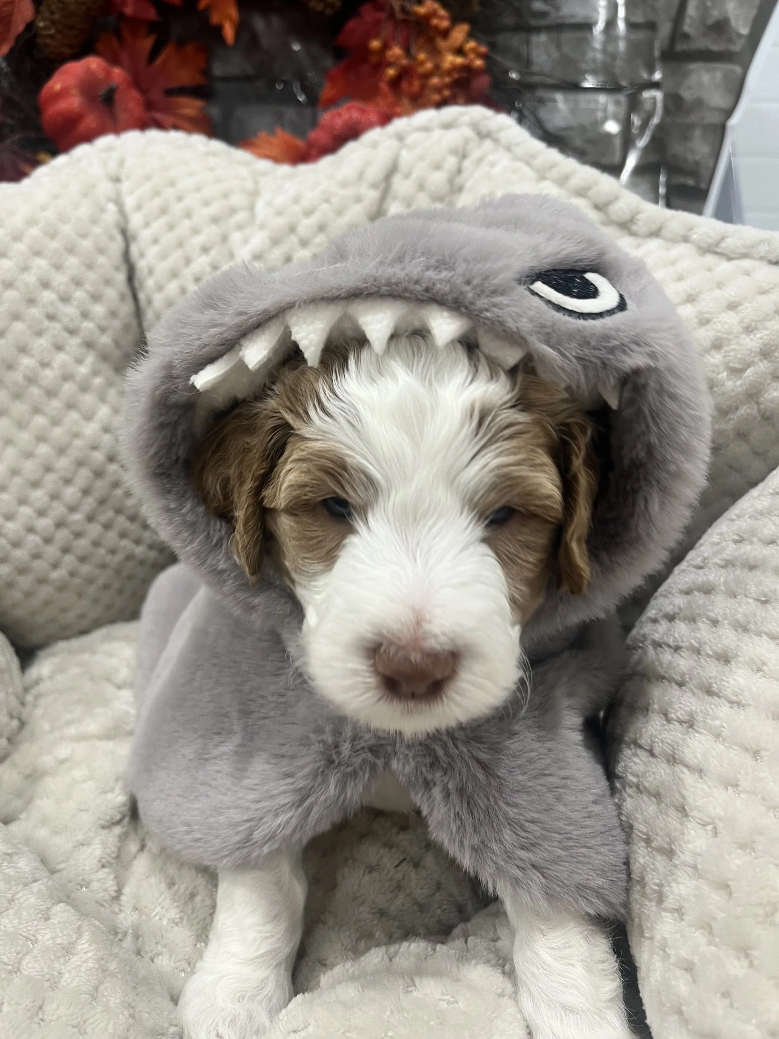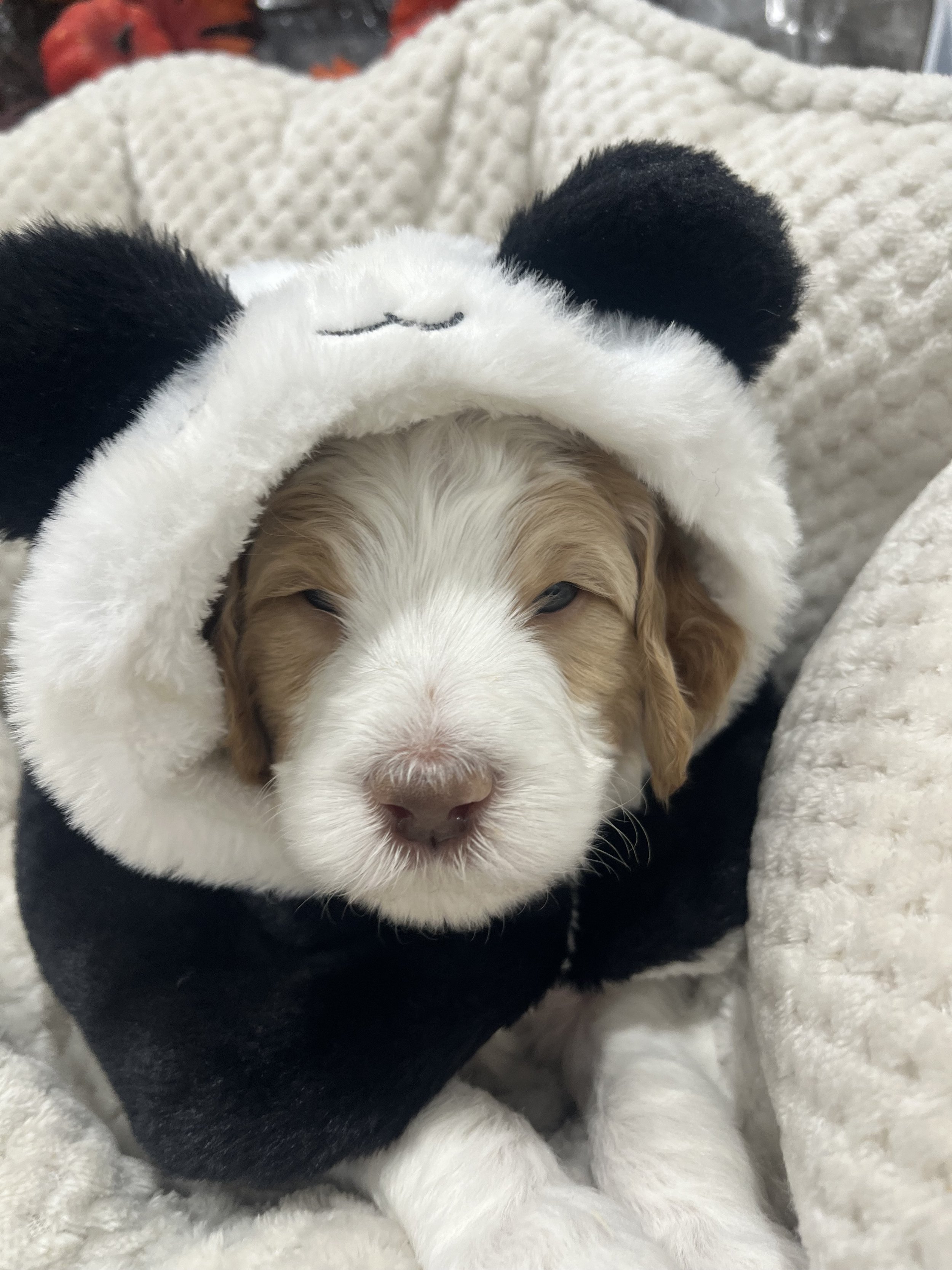 These medium goldendoodle puppies have wavy parti coats. We anticipate them to be 30-45 pounds full grown.