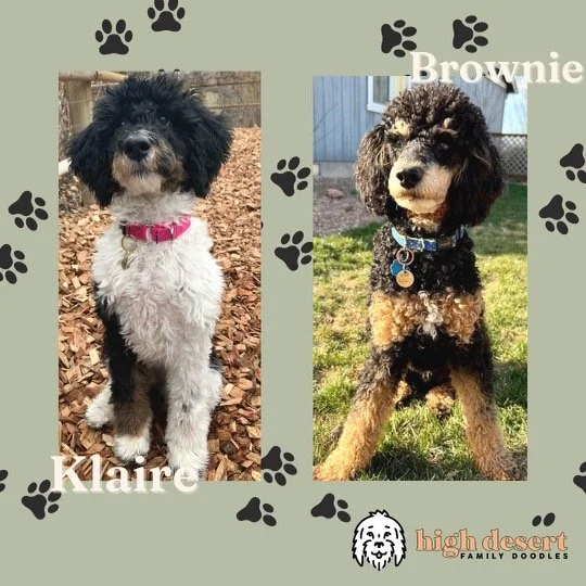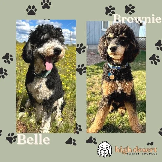 Rosie is an apricot F1b mini-goldendoodle, and Brownie is a phantom moyen Poodle. Their genetics make so many color traits possible.
