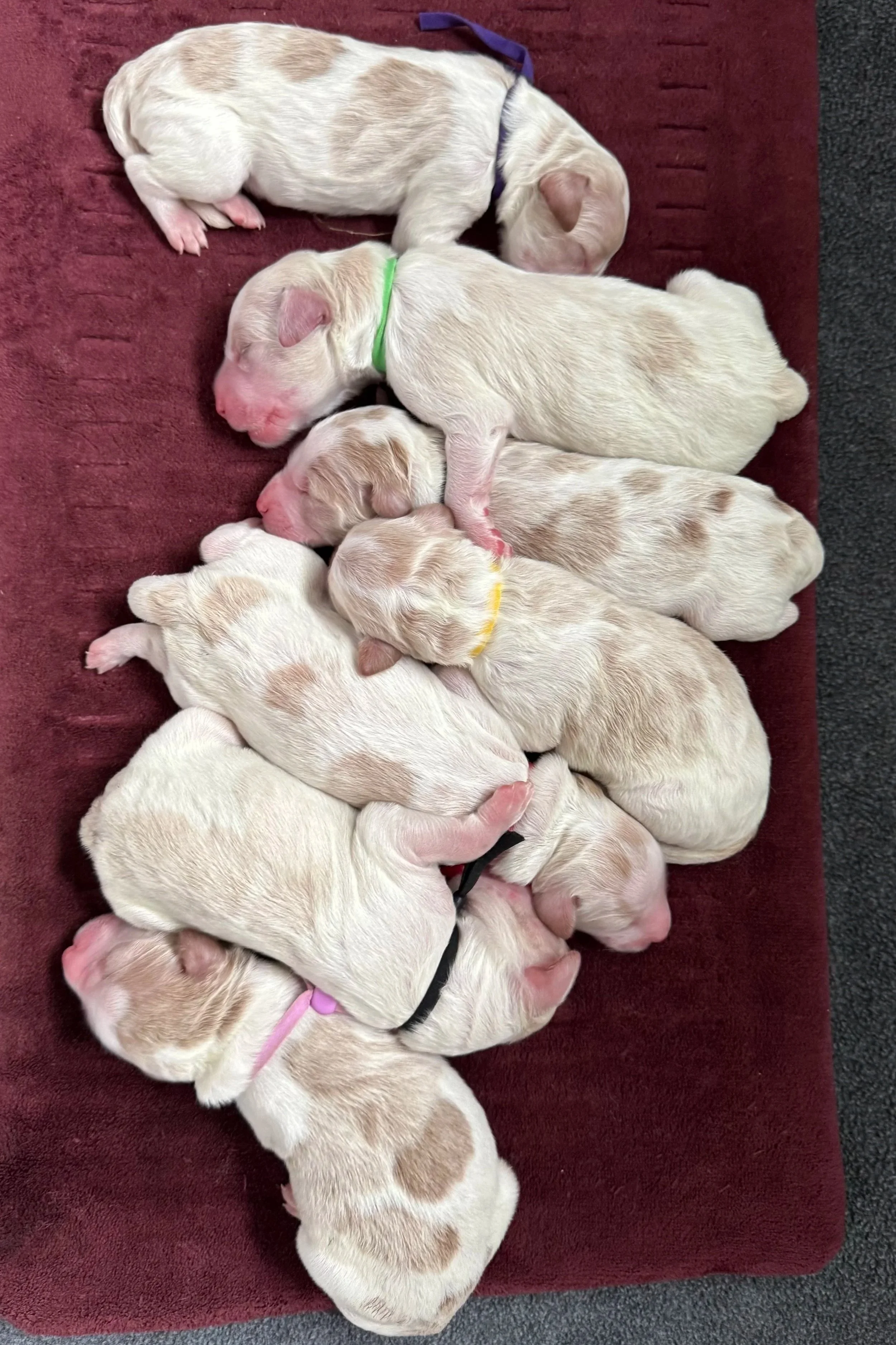 Maple was bred with Luca, so we anticipate these puppies to have a mature weight of 35-50 pounds, with straight parti coats.